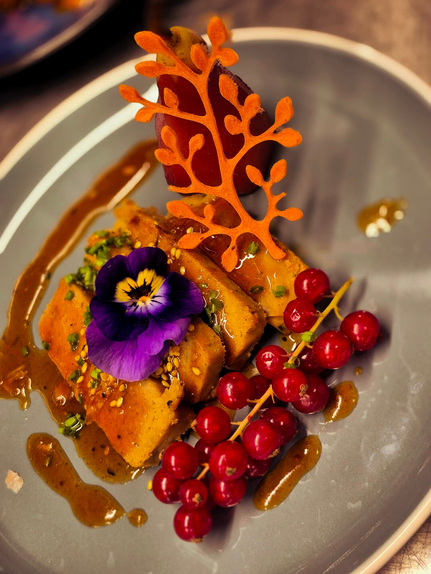 Course I: Tataki beef and kosho yuzu or Foie gras (duck liver), poached pear and brioche bread